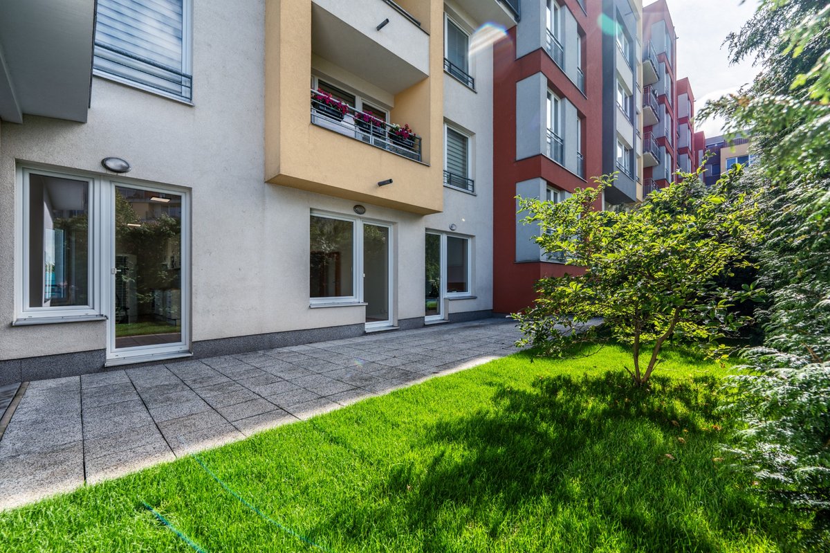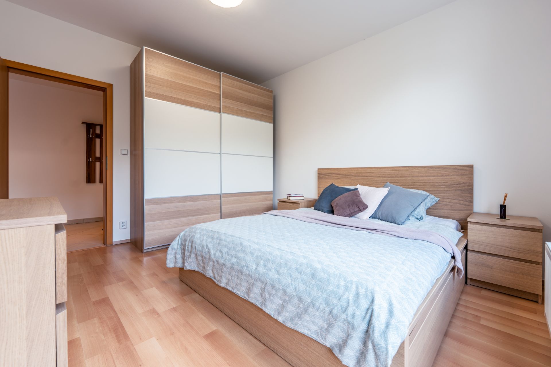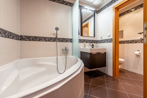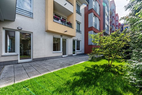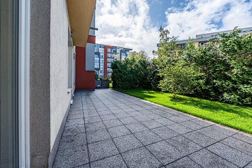 Byt se skládá z prostorné předsíně, ložnice se vstupem na terasu, koupelny s rohovou vanou, samostatné toalety a světlého obývacího pokoje s kuchyňským koutem a jídelnou a také se vstupem na terasu.