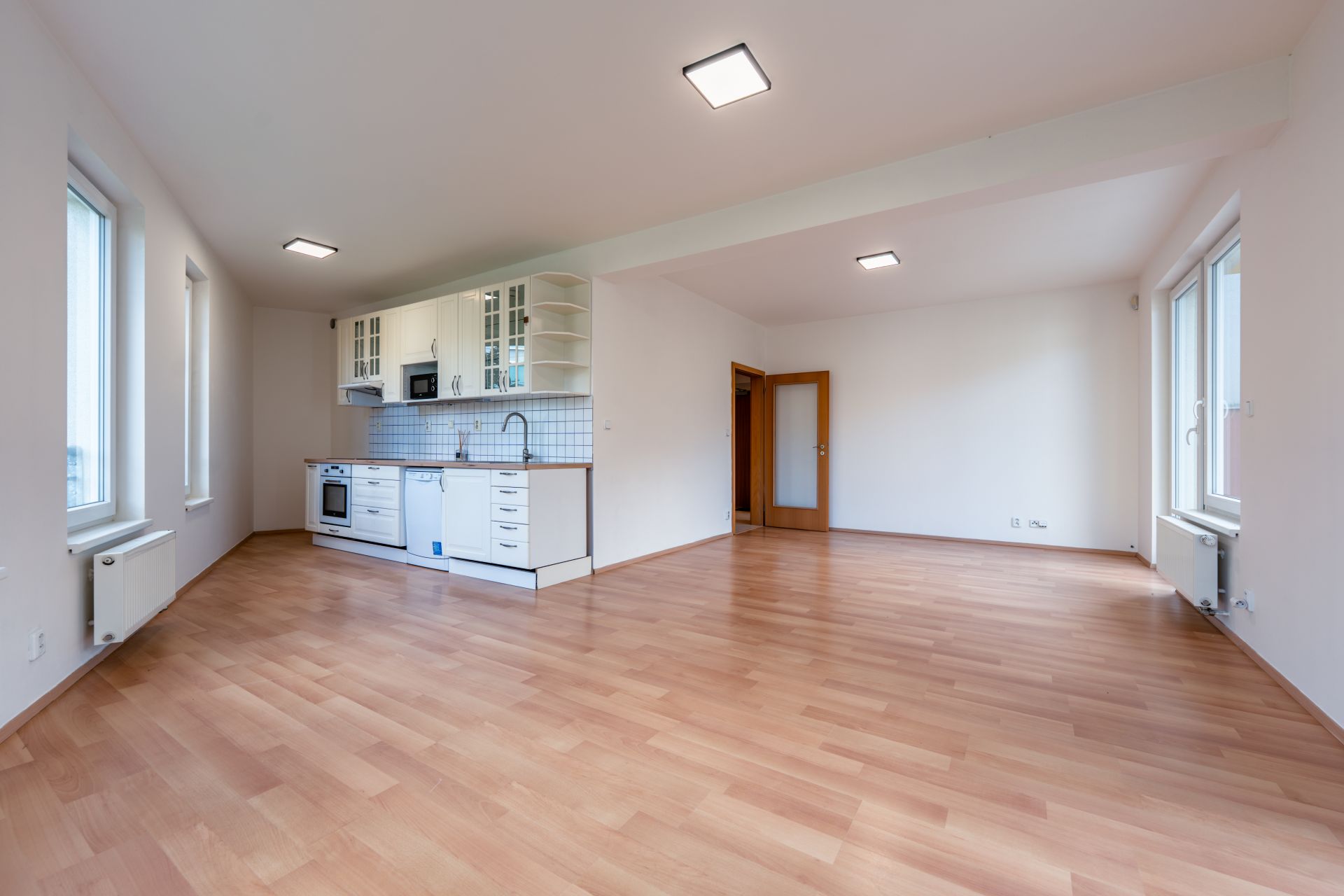 Obývací prostor je tak velkorysý, že je možné jej klidně rozdělit na 2 místnosti a změnit tím dispozici na 3+kk - prostoru i oken je dostatek.