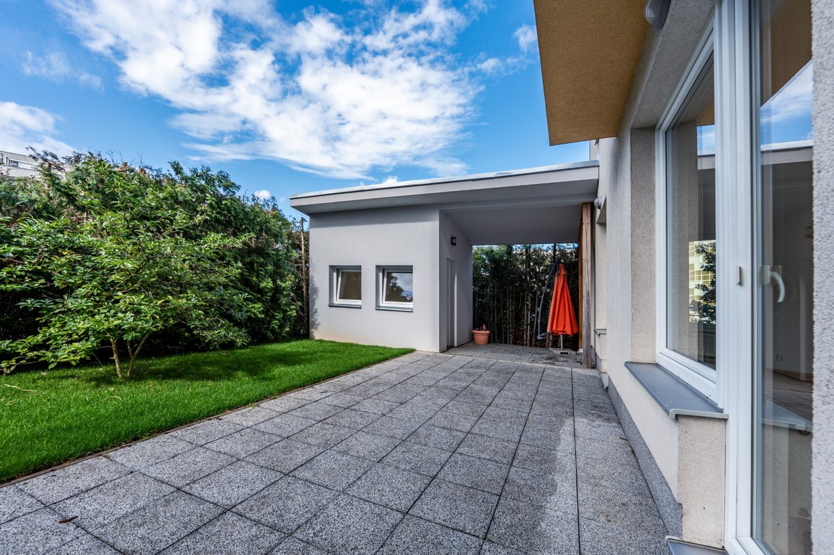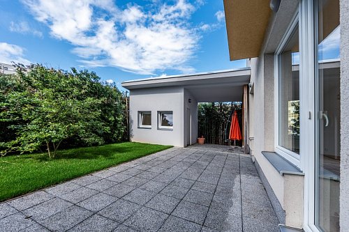 Velkorysá terasa, anglický trávník, vzrostlé dřeviny a keře zajišťují dostatek soukromí.