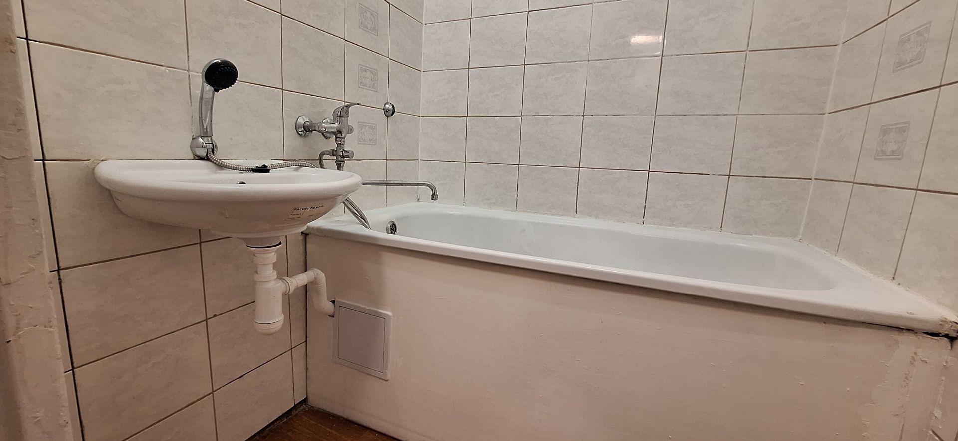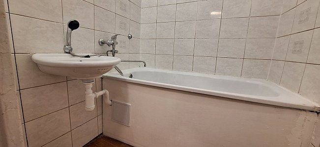 Dispozice bytu zahrnuje kuchyň s kuchyňskou linkou a elektrickým sporákem, což zajišťuje pohodlné vaření a přípravu jídel. Dále jsou k dispozici dva samostatné pokoje a koupelna s vanou a umyvadlem.