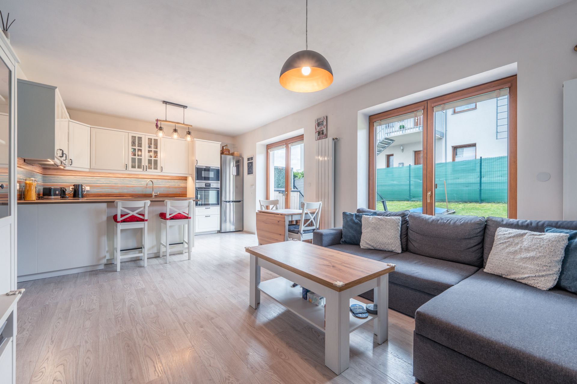 prostorný obývací pokoj s kuchyňským koutem a vstupem na terasu