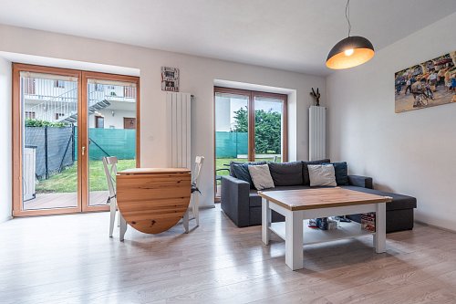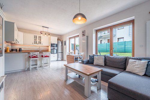 Prodej plně vybaveného moderního bytu 4+kk o ploše 84 m² se zahradou 195 m² se nachází v klidné části Mníšku pod Brdy.